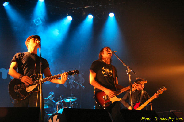 | Après un court entracte, la deuxième partie me fait découvrir les 400 Lapins, groupe de rock pur et dur composé de Jérôme Turgeon (voix, guitare), François Bernier (basse), Gabriel Tremblay (batterie) et Mathieu Legault (guitare, voix). Le groupe est en pleine période de composition ces temps-ci et a accepté de sortir de sa tanière (pour des lapins c'est logique), histoire de participer eux aussi à cet événement unique. La majorité des chansons du spectacle proviennent de leur album Respirer mais nous avons aussi eu droit à quelques nouvelles pièces qui pourraient faire partie de leur prochain album. Ainsi donc, Des kilomètres, Bebelle, La marche, Un beau gros bovidé, Bombe, Funeste funambule et quelques autres sont venues chatouiller les oreilles des amateurs de bon rock. Il y a beaucoup d'affinités entre la musique des 400 Lapins et celle de Volume 10, les deux groupes ayant saisi l'importance de produire du matériel accrocheur sans donner dans le bonbon. Ils ont souvent eu l'occasion de partager les même scènes et le même public, il était donc logique que Volume 10 fasse appel aux Lapins pour les précéder ce soir et mettre la table pour eux. J'ai saisi une belle chimie et un élément de respect entre les membres des trois groupes. Pas de jalousie, juste l'envie de travailler ensemble à promouvoir le genre musical auprès des masses de 15 à 75 ans... et il y en avait de tous les âges ce soir dans la salle. |