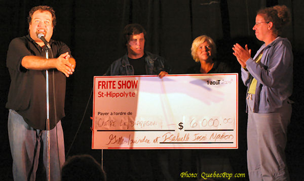 | C'est la belle animatrice de Flash, Patricia Paquin qui a eu l'honneur de lancer ce troisième Frite Show et d'inviter l'organisateur humoriste Gilles Guindon à monter sur scène. Lui et son épouse, Isabelle-Josée Nadon, propriétaires de la Patate du Ruisseau (St-Hippolyte) on choisi de créer ce concept il y a deux ans afin de ramasser des fonds pour des oeuvres caritatives. Après avoir offert 1000$ à l'organisation locale de soccer en 2003 et 4000$ à l'organisation de lutte contre le cancer en 2004, ils comptaient offrir la collecte 2005 au Centre Le Diapason, une auberge du cœur qui vient en aide aux jeunes en difficultés dans