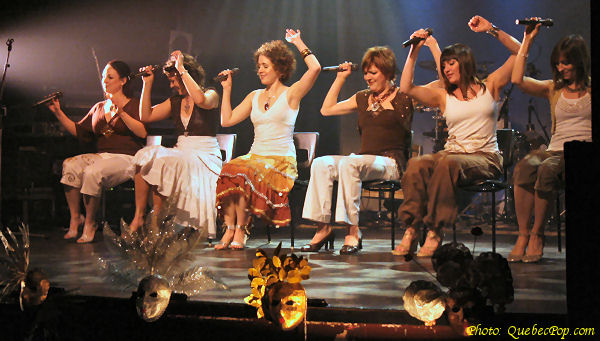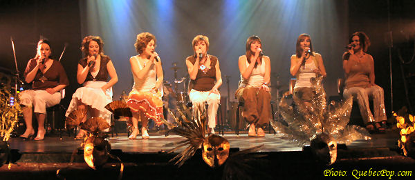 Sabourin et Andrina Turenne se complètent merveilleusement.Au total, elles chantent en 17 langues alors que l'album contient 14 chansons. Le spectacle lui comporte plus de 19 chansons puisées parmi les pièces de leurs deux albums. Notons le mélange harmonieux de cultures que le groupe nous permet de visiter par le biais de la musique: Croatie, Bulgarie, Brésil, Inde, Pologne, Israël, etc. Dignes représentantes de la culture canadienne aussi, elles nous ont représenté de Terre-Neuve à Vancouver, tout comme en France et en Amérique du sud. Le nouvel album s'intitule Pléiades, représentant selon la mythologie grecque, les sept filles d'Atlas transformées en étoiles par le grand Zeus. La pochette de l'album nous montre sept petites étoiles qui scintillent dans le ciel, sept astres qui représentent les sept membres du groupe qui, chacune de son côté, possèdent leur propre carrière artistique. Regroupées, elles forment une constellation de talent vocal. Leur spectacle contient beaucoup de danse, de mouvements, de petites mises en scène, permettant ainsi à chacune des artistes de dévoiler son propre talent mais toujours en symbiose avec le reste du groupe. Beau à voir et à entendre. |