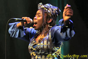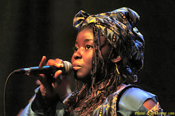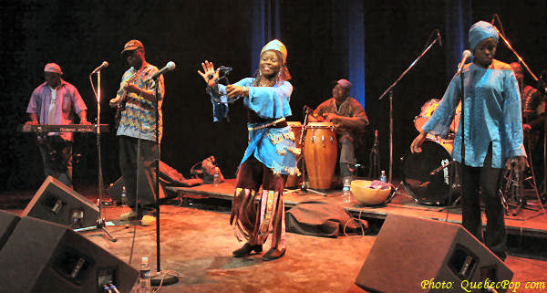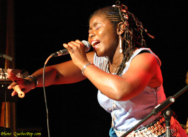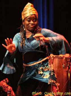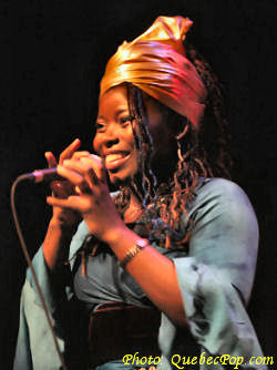 C'est dans le cadre du 15e anniversaire de Musique Multi Montréal, que j'ai eu l'occasion de revoir l'énergique Muna Mingole en spectacle, tout en visitant pour la première fois la charmante Maison de la Culture de Pointe aux Trembles. Le spectacle mettait en vedette les chansons du premier album de Muna, intitulé Dipita, et paru l'automne dernier. Assister à un spectacle de Muna c'est faire un voyage sur les ailes d'ambiances africaines. C'est un festin pour les sens, l'ouïe évidemment mais aussi l'oeil puisque les costumes colorés et les danses traditionnelles font autant partie de l'ensemble que les chansons elles-mêmes. Ce soir, histoire de nous faire passer un bon moment dans de pures ambiances africaines, Muna a fait appel à des musiciens originaires de ce continent dont Mylène Otou (Cameroun: choeurs), Guy Langue (Cameroun: basse), Dominik Donka (Ghana: percussions), David Mobio (Côte d'Ivoire: claviers) et Elidjo Mpati (République Démocratique du Congo: guitare). Il faut aussi compter un cousin d'Amérique, soit Réginald Dantiste (Haïti: batterie). Quoi de mieux pour célébrer l'arrivée du printemps qu'un spectacle plein de chaleur et de rythmes camerounais dont le makossa et le bikutsi, un spectacle qui englobe aussi des sonorités sénégalaises, fusionnant au passage le jazz et les influences d'Afrique du Sud. Celle que l'on appelle affectueusement la flamme bleue du Cameroun est une auteure, compositrice et interprète de grand talent. Sa voix est charmante avec ce petit accent d'outre-mer. Elle chante en français, en anglais et en douala, la langue de ses origines. Parmi ses chansons, on compte Sesa longue, Petite fille, Hommage, Village, Afrika, Mumi et plusieurs autres. Elle n'hésite pas à faire participer la foule et certaines personnes descendent même sur scène pour danser avec elle... pas toujours avec la même habileté technique que cette danseuse de carrière, mais avec beaucoup de plaisir et de bonheur. Muna sera sur scène à Québec, les 21 avril et 2 mai et à Gatineau le 30 avril prochains, allez-y découvrir une artiste chaleureuse et généreuse ! Pour plus d'informations, visitez le www.munamingole.com. |